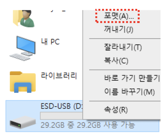 인식된 usb 스틱 아이콘을 마우스 오른쪽 버튼 클릭한 후 '포맷'을 선택한다